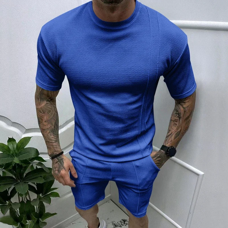 Cross border fast sale summer new men's pullover crew neck t-shirt athleisure top men's short sleeve shorts suit