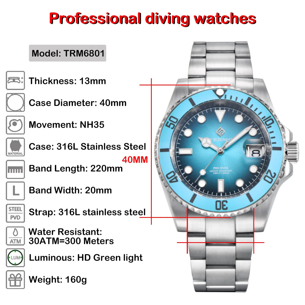 FeelNever Water Ghost Diver Watch Men Luxury Business NH35 Automatic Mechanical Watch Sapphire Waterproof 300m 316L Full Steel